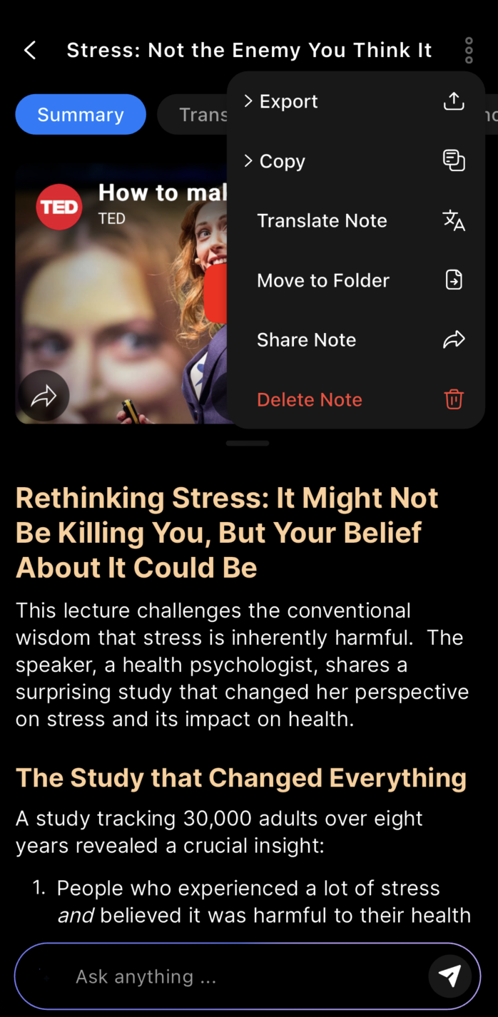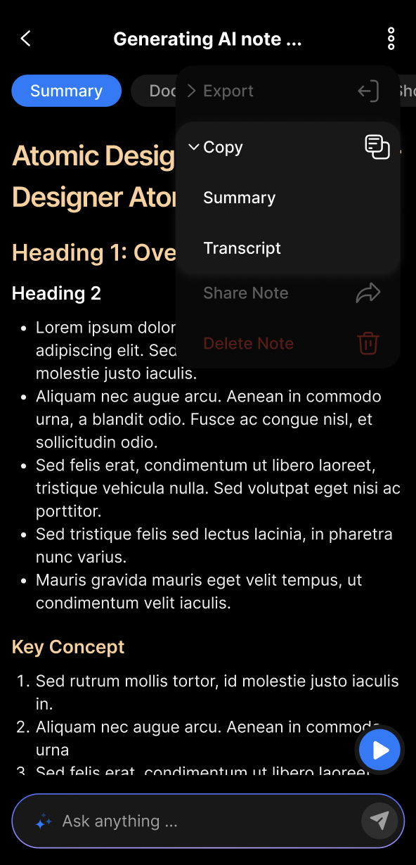 Open the note detail, click the More button (top-right corner), then select Copy. Choose either Summary or Transcript to copy the content to your clipboard.