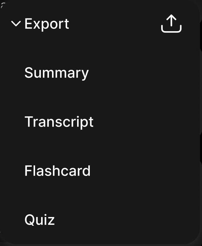 The Export Note feature allows you to export a note in multiple formats, making it easy to share, store, or reuse the content for study or work. You can export your note as a Summary, full Transcript, a set of Flashcards, or a Quiz.