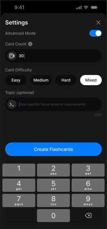 - Flexibly adjust number, difficulty, and topic of flashcards to suit your learning needs.