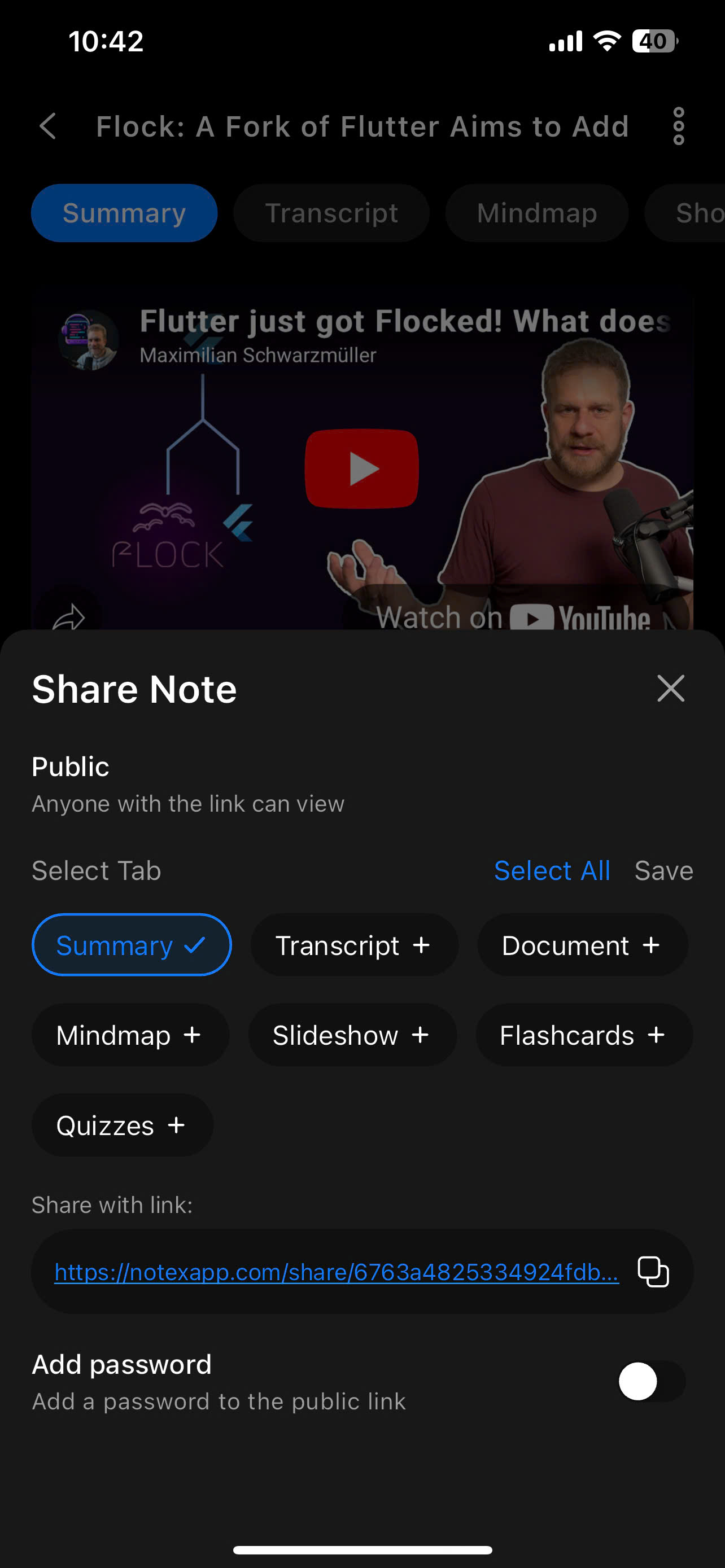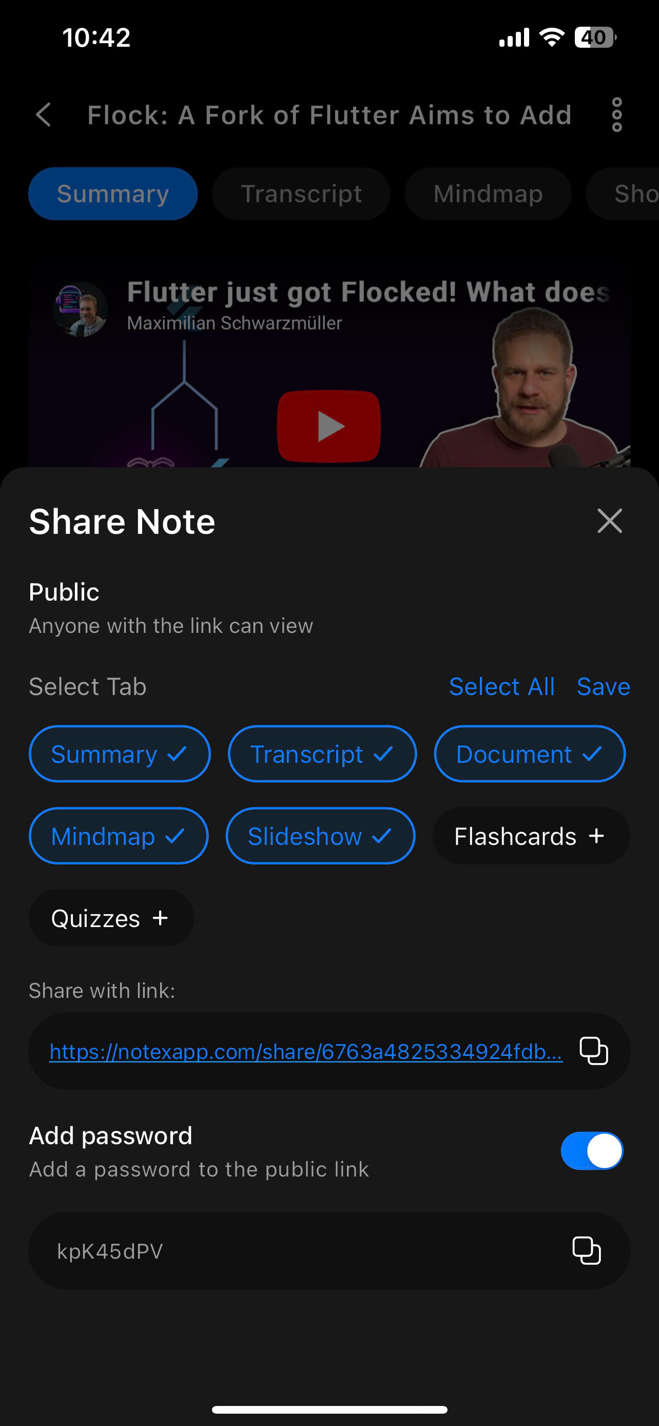 - Choose specific content to share: Summary, Document, Mindmap, Flashcards, etc.