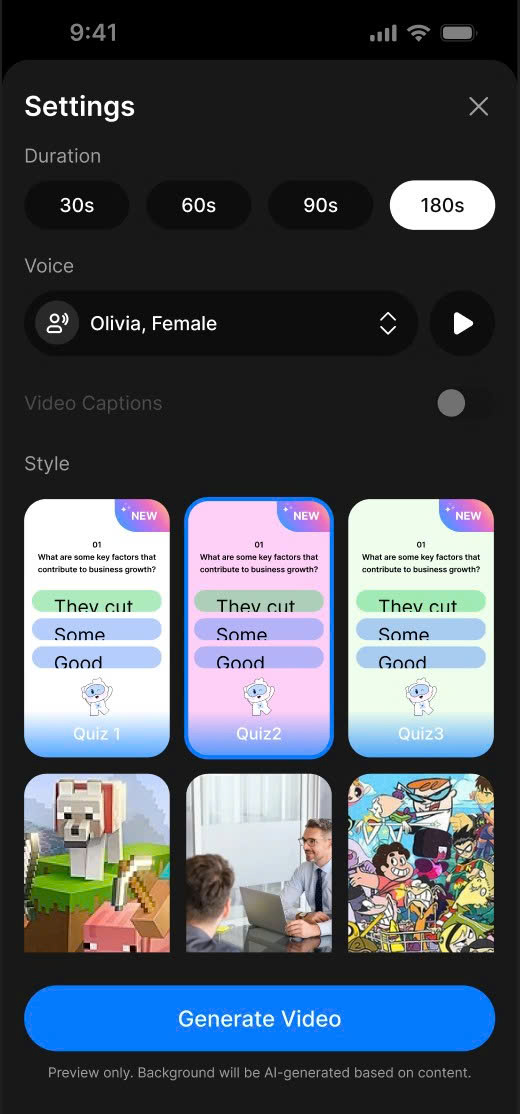 - For Quiz Shorts, the video background is automatically generated by AI to match your content, making it more dynamic and relevant.