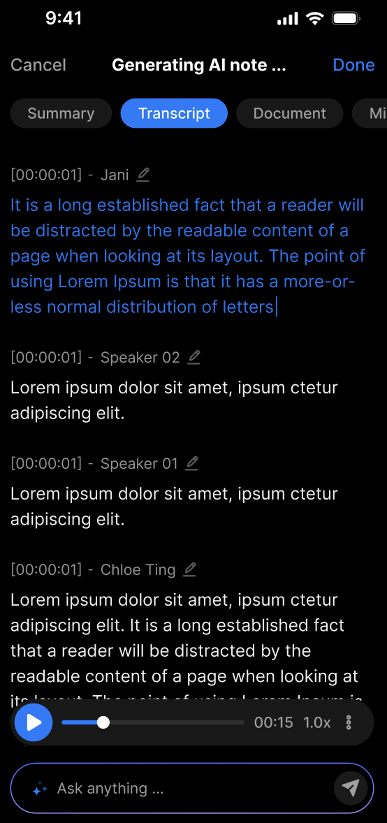 The system automatically detects different speakers and tags each speech segment with a speaker label (e.g., Speaker 1). You can rename speakers manually.