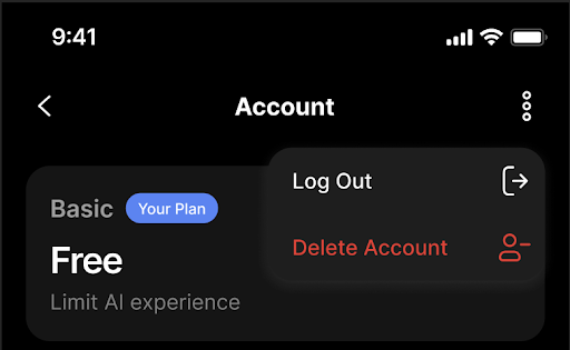| Delete Account Option | Menu Item | Tap to delete your account and all associated data |