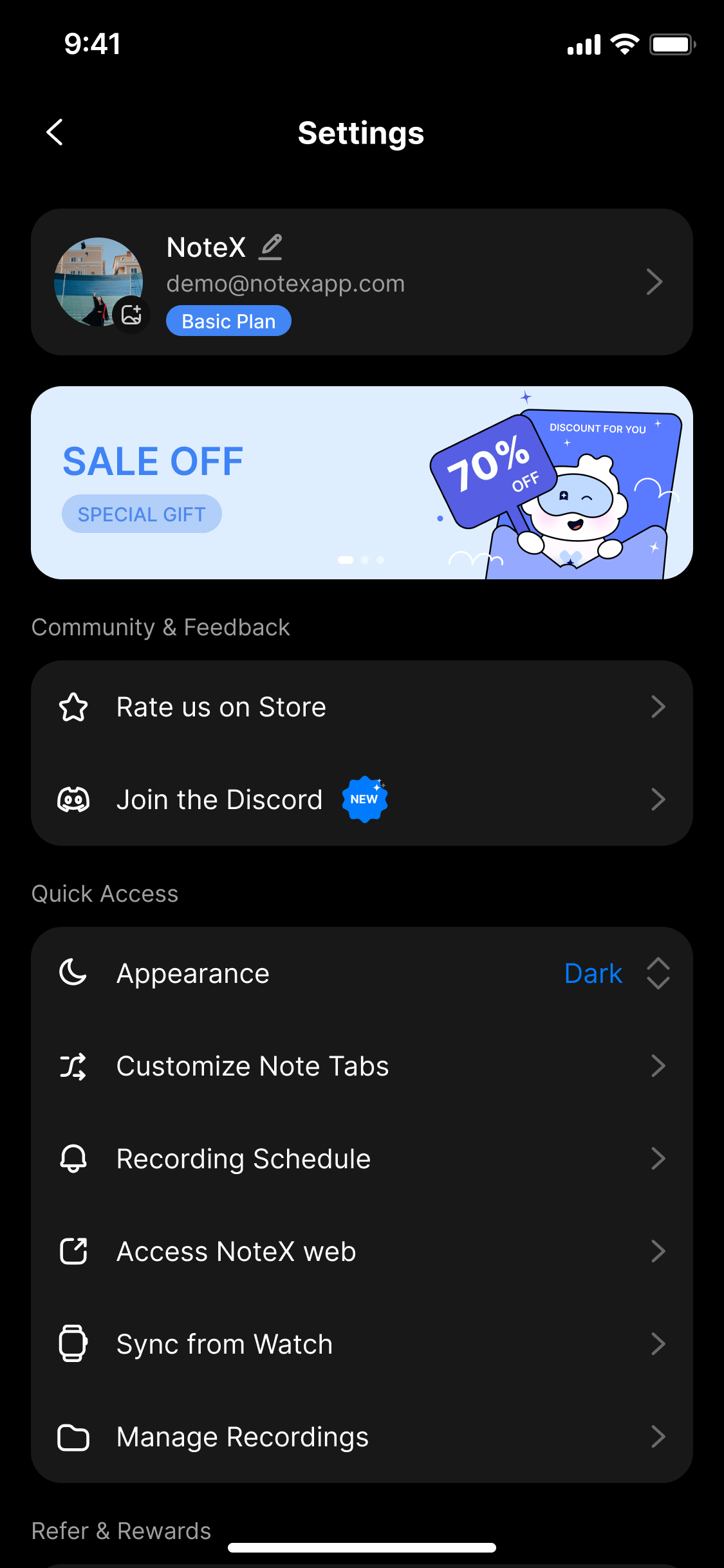 The Logout feature allows you to safely sign out of your current account on the NoteX app, while Delete Account lets you permanently remove your account and all related data from the system.